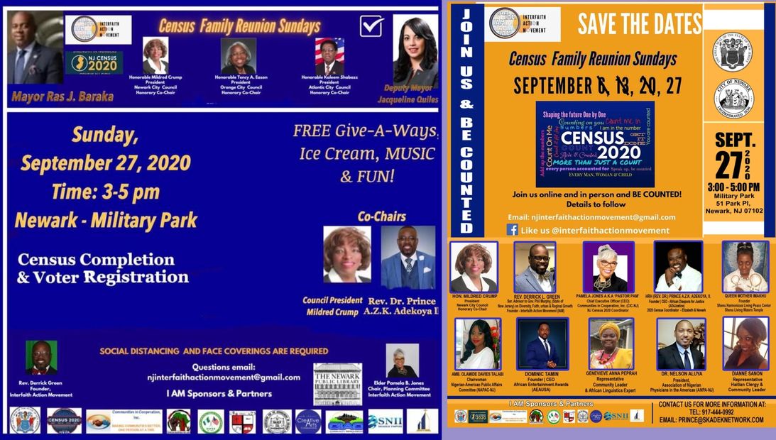 JOIN US NJ State Census; The Great City of Newark, NJ; Interfaith Action Movement - I AM; African Diaspora For Justice and others ON SUNDAY, SEPTEMBER 27TH, 2020 FOR THE #2020CENSUS DRIVE AT THE MILITARY PARK, NEWARK AT 3:00 - 5:00PM Refreshments, ice-cream, music, goody bags are waiting for you. Can we COUNT on you?